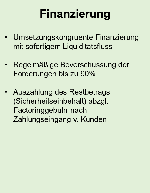 Factoring tauscht den Wert des Forderungsbestandes in bares Geld und veschafft dem Unternehmen die Finanzmittel für anstehende Investitionen, Reorganisationsmaßnahmen, für zukunftssichernde Produkt- oder Marketingkonzepte und zur Optimierung des Finanzmanagements.