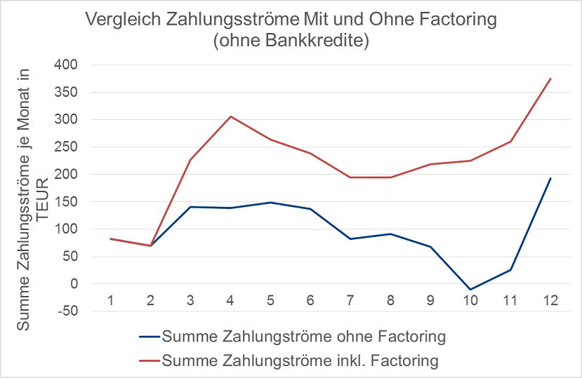 Die Zahlungsströme (Saldo monatl. Ein- und Auszahlungen) zeigen eindrucksvoll die liquiditätssteigernde Wirkung von Factoring. Der bisherige Forderungsbestand wird in diesem Beispiel vom Factor nicht abgekauft und fließt somit dem Unternehmen sukzessive zu. Factoring wird ab März eingeführt und liegt in den folgenden Monaten weit über der Betrachtung ohne Factoring (ungefähr eine Verdoppelung der Liquidität).