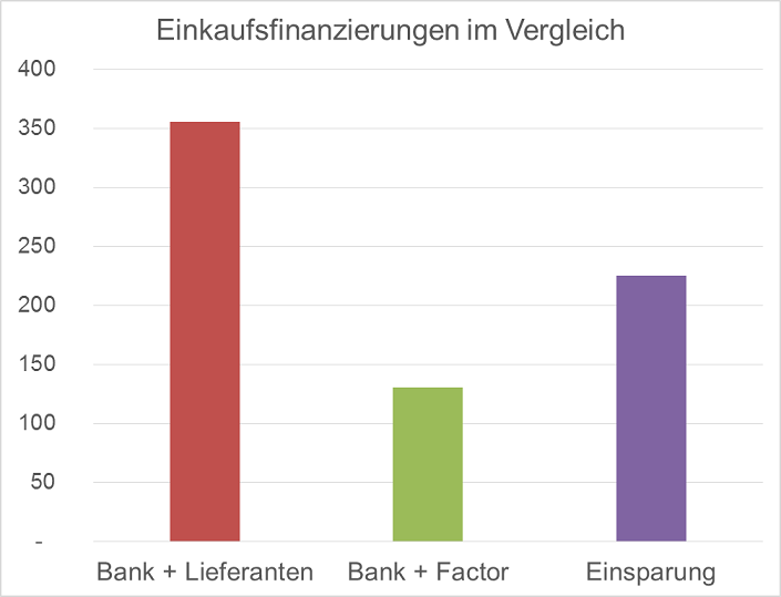 Die untenstehende Darstellung veranschaulicht die beiden Einkaufs-Finanzierungskonzepte in einem Vorher (Bank + Lieferanten) und Nachher (Bank + Factor) -Vergleich. Die teure Lieferanten-Finanzierung wurde komplett durch die Einkaufs-Finanzierung des Factors abgelöst. Im Beispielfall konnte durch die Nutzung von Skonti und Boni ungefähr 225 TEUR p.a. eingespart werden!