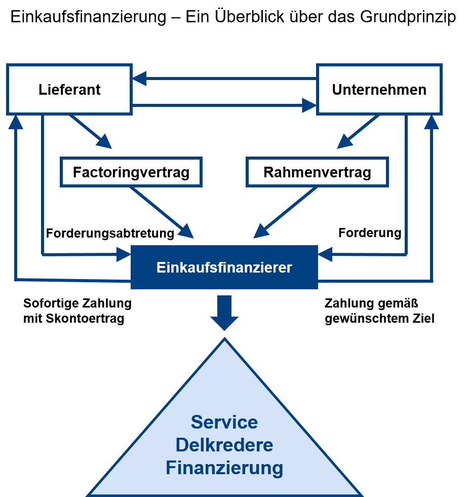 Das nachfolgende Schaubild zeigt das Geschäftsmodell der Einkaufsfinanzierung bzw. von Reverse-Factoring als "Dreiecksbeziehung" zwischen dem Lieferanten und dem Unternehmen /Abnehmer (Bestellvorgang und Lieferung) einerseits und andererseits zwischen dem Lieferanten und Factor (Forderungsabtretung und Rechnungsbegleichung) sowie zwischen dem Unternehmen und dem Factor (Rahmenvertrag und Vorfinanzierung).